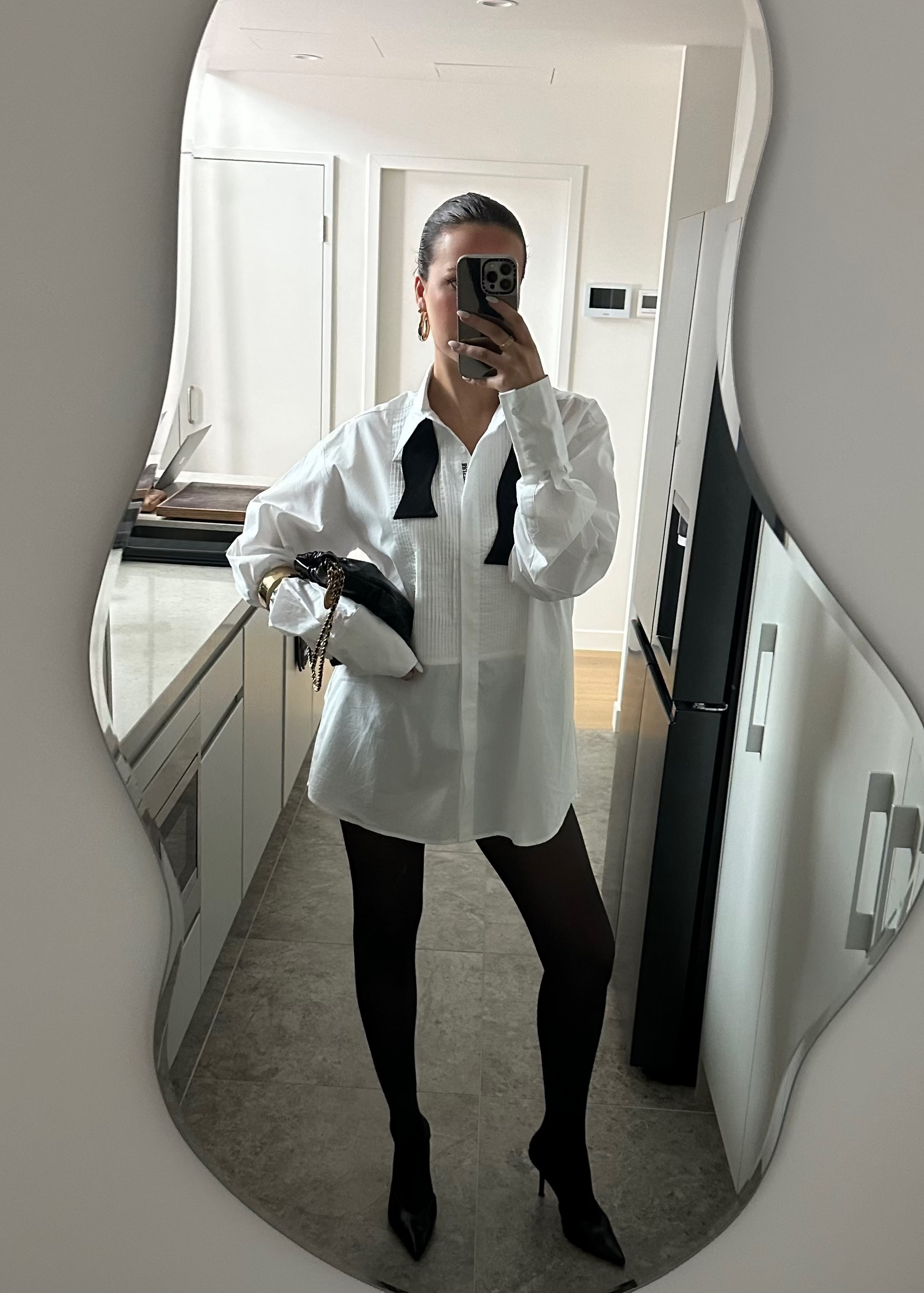 Embrace timeless elegance with the AFTERPARTY SHIRT, designed to complement our ‘cool girl’ attire. This shirt features a sophisticated pleated bib detail and removable bow tie feature at the collar completes the commanding look. The oversized take on masculine tailoring makes it the perfect balance of comfort and high fashion. The final Bristowe touch is the embroidered placket detail.