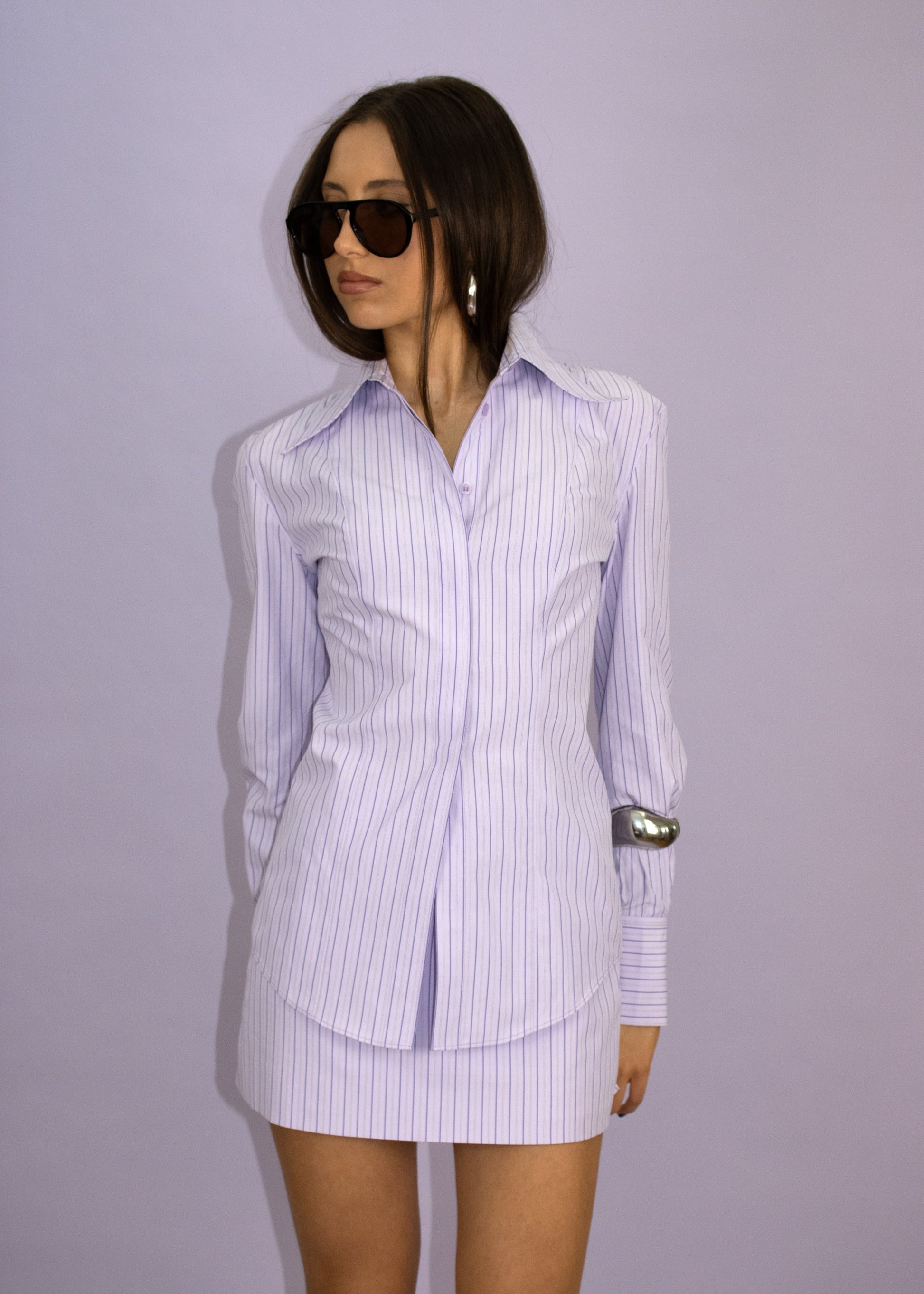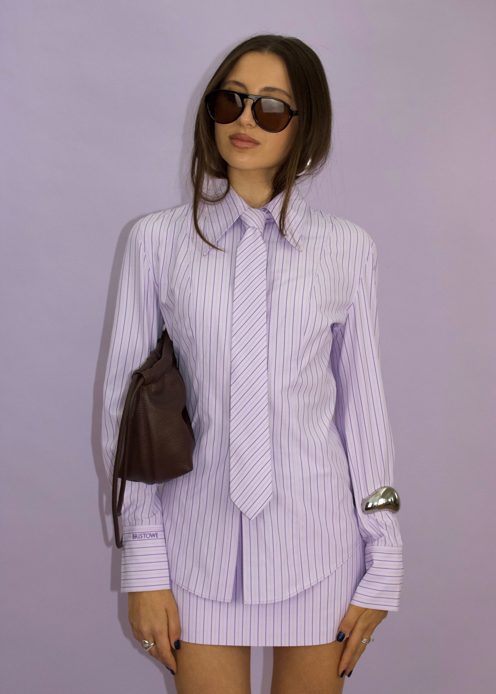 The Jensen Shirt reimagines corporate wear for the modern cool girl. Fitted silhouette, tailored in a lilac pinstripe cotton blend with matching necktie, sharp collar and signature Bristowe cuff embroidery. Pair with The Jensen Mini Skirt to complete the look.
